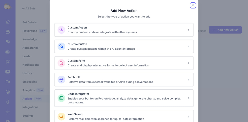 Each action comes with customizable trigger instructions — you define when the bot should execute it. For example: “When the user asks to schedule a demo, create a Google Calendar event.” This turns a simple chatbot into a true AI agent that can take action on behalf of your business.