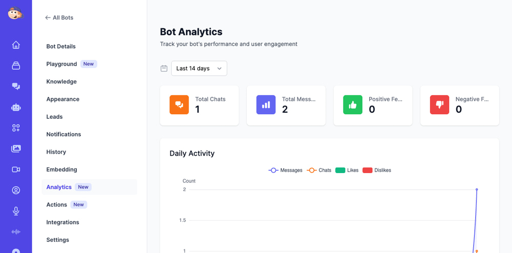How do you know if your chatbot is actually helping? The built-in Analytics dashboard gives you real-time insights into your bot’s performance.