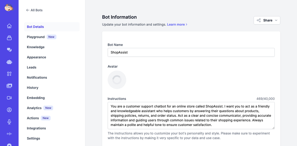You can edit the bot name, customize the instructions, and adjust the temperature slider (lower = more precise answers, higher = more creative responses). The instructions field supports up to 40,000 characters, giving you complete control over how your chatbot behaves.