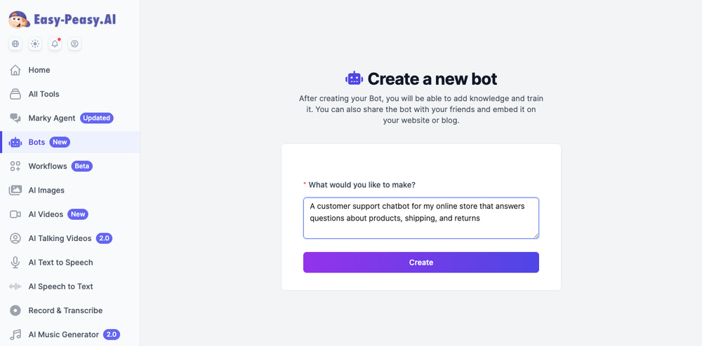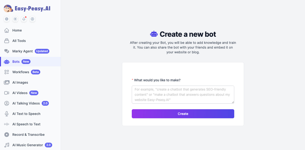 Go to the Easy-Peasy.AI Bots page and click Create a Bot. You’ll see a simple form asking: “What would you like to make?”