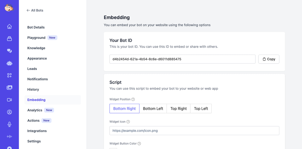 - Go to the plugin settings and paste your Bot ID (found on the Embedding page)