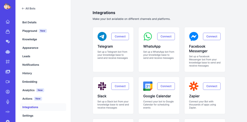 Easy-Peasy.AI bots don’t just live on websites. You can connect the same chatbot to multiple channels from the Integrations page: