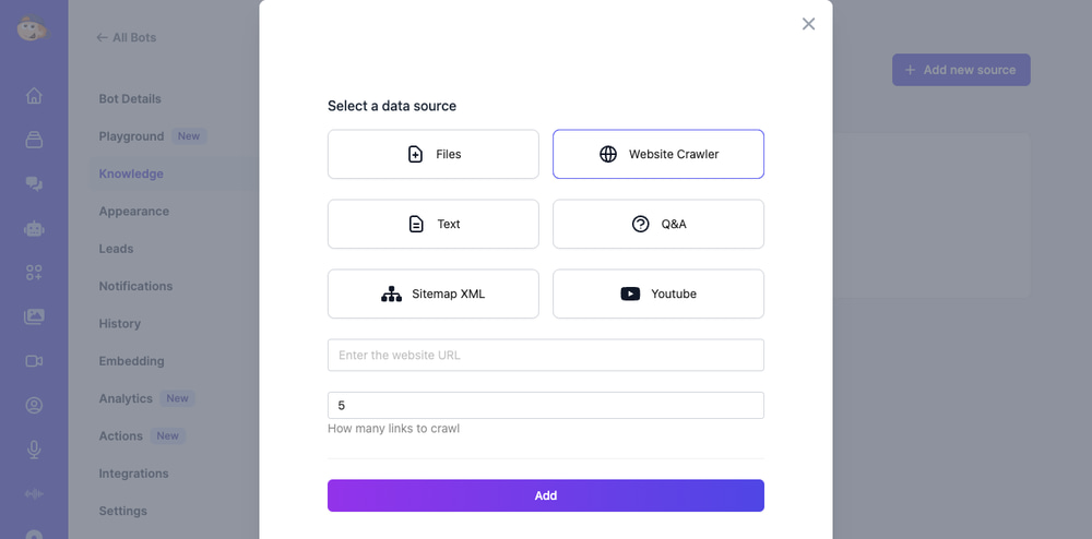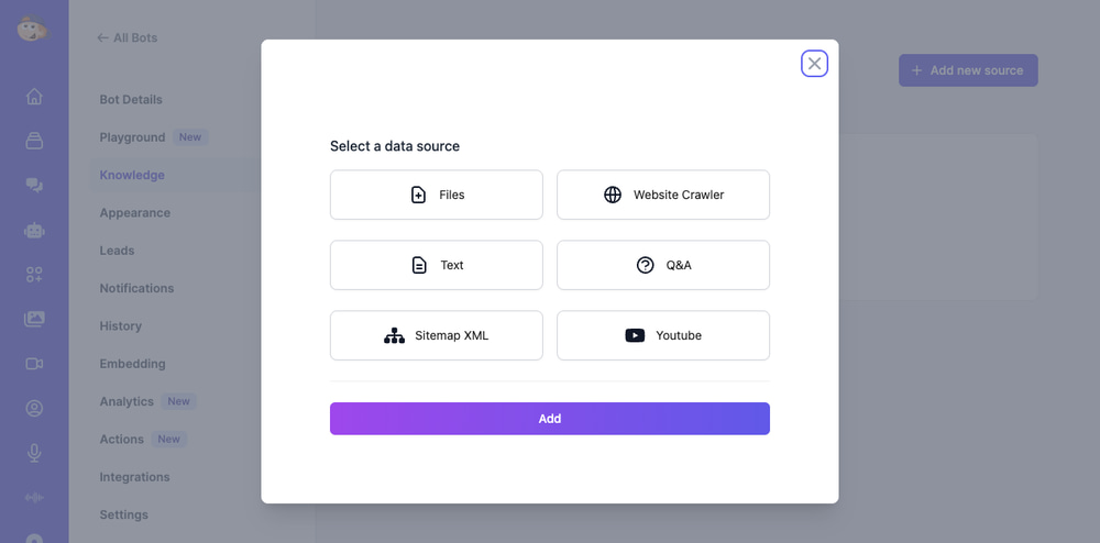 This is where the magic happens. Navigate to Knowledge in the left sidebar and click Add new source. You can train your AI chatbot using six different data source types: