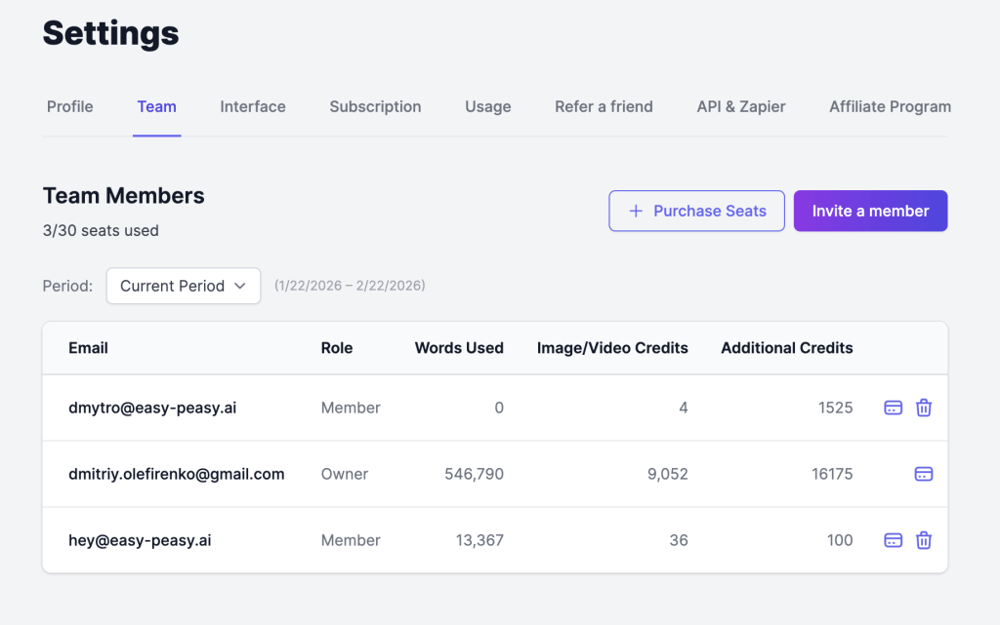 - Track individual usage — See exactly how many words, image credits, text-to-speech characters, and transcription minutes each team member has used
