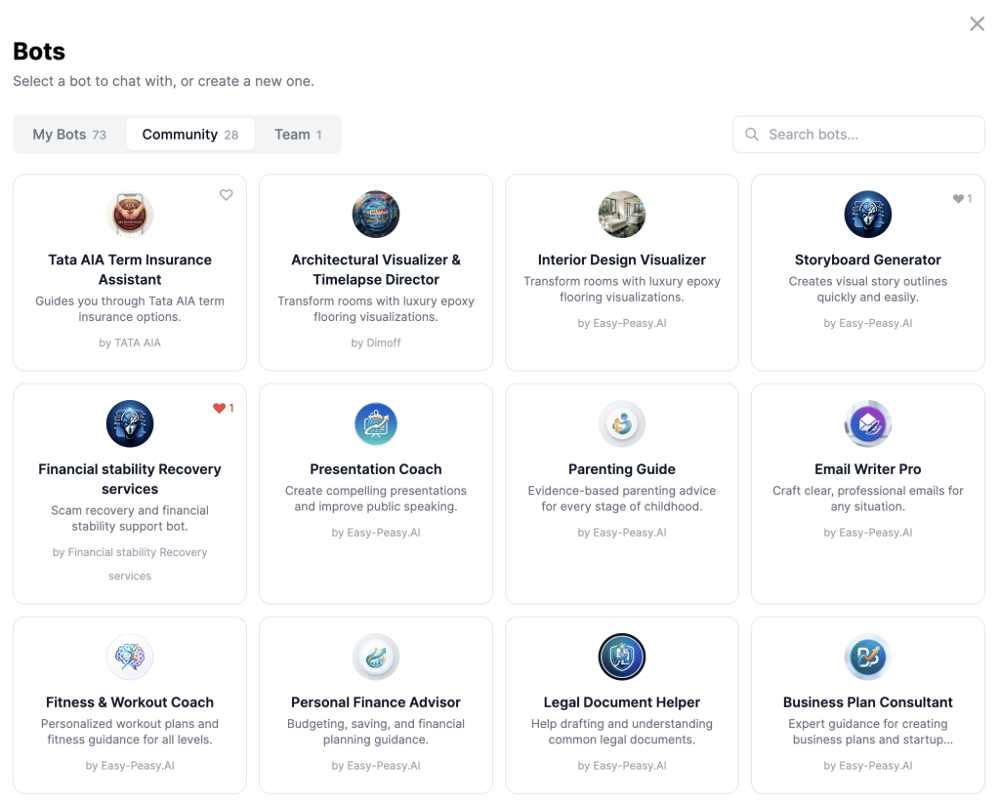 Each bot is configurable with your choice of AI model (Claude, GPT, Gemini), custom instructions, temperature settings, and RAG (Retrieval Augmented Generation) for accurate, source-backed answers. Share bots with your team using the Team badge — visible right in the dashboard.