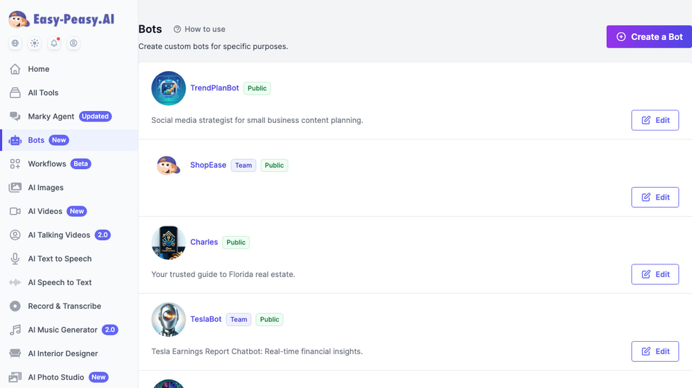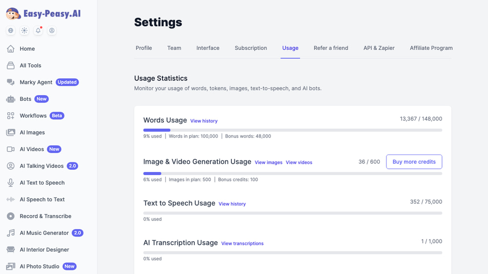 Using five different AI tools for five different tasks creates complexity and increases costs. Choose a comprehensive platform like Easy-Peasy.AI that handles multiple use cases in one place — text, images, audio, video, and chatbots.