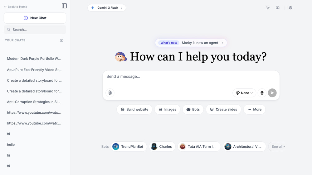 Marky isn’t just a chatbot — it’s a full AI agent that can take action on your behalf. It goes beyond answering questions to actually building, researching, coding, and creating.