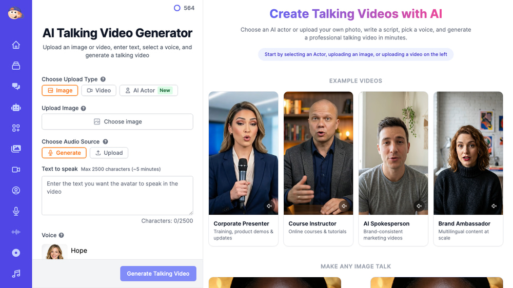 - Custom image/video input — Upload your own portrait or video to create a talking avatar