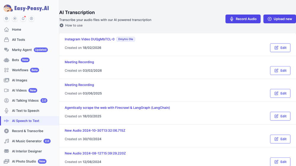 The AI Transcription tool converts audio and video files to accurate text transcripts. It supports 40+ languages with speaker detection, so you always know who said what.