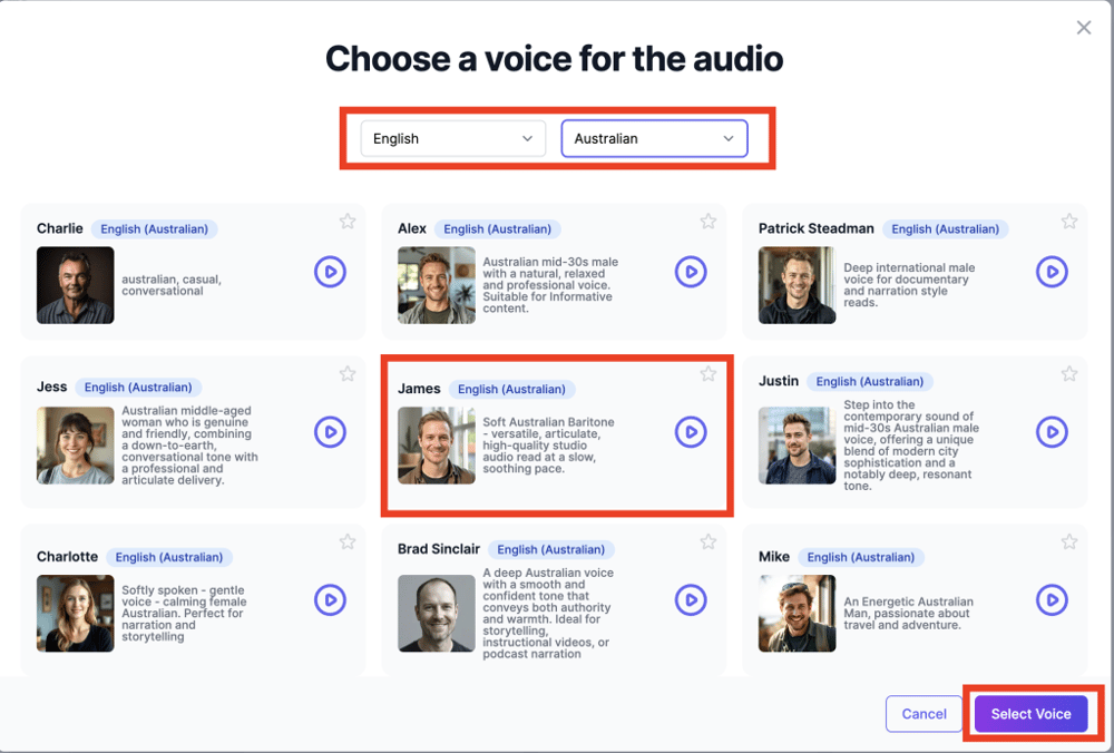 Click the “Change Voice” button to open our voice selection modal. Here’s where you’ll find your ideal Australian accent: