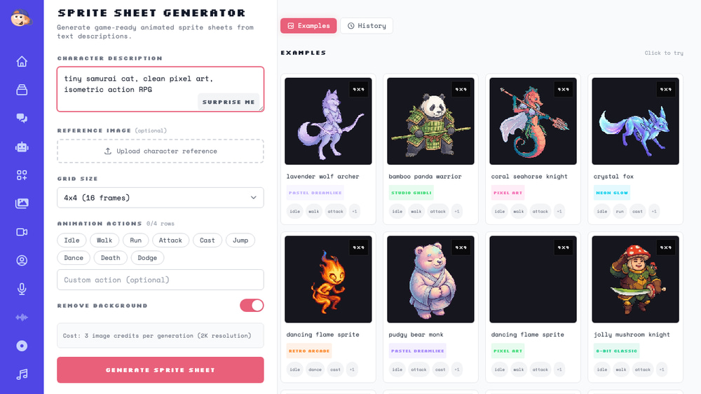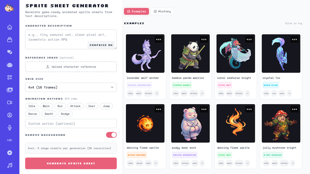 Each sprite sheet generation costs 3 image credits, regardless of the grid size you choose.