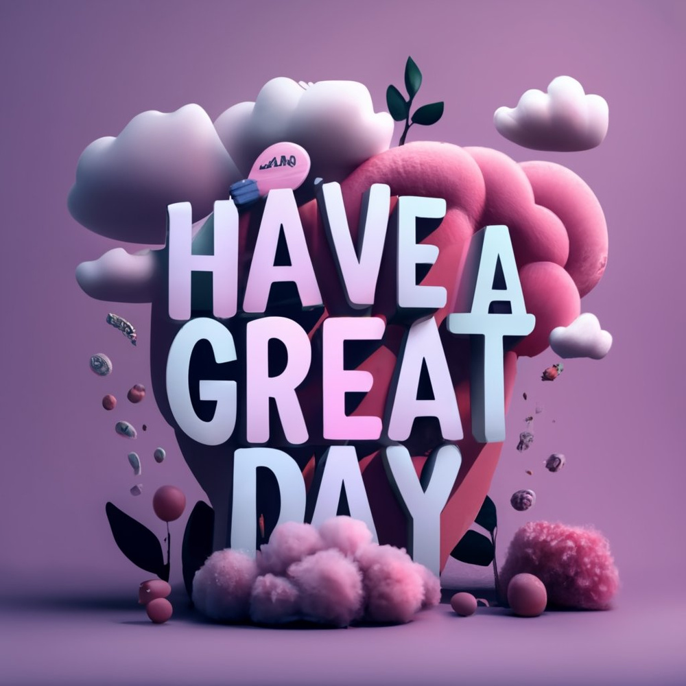 A fluffy cute floating items floating in the background with text,” Have a great day” and AI word pastel purple with a light touch of magenta, 4k made with Ideogram