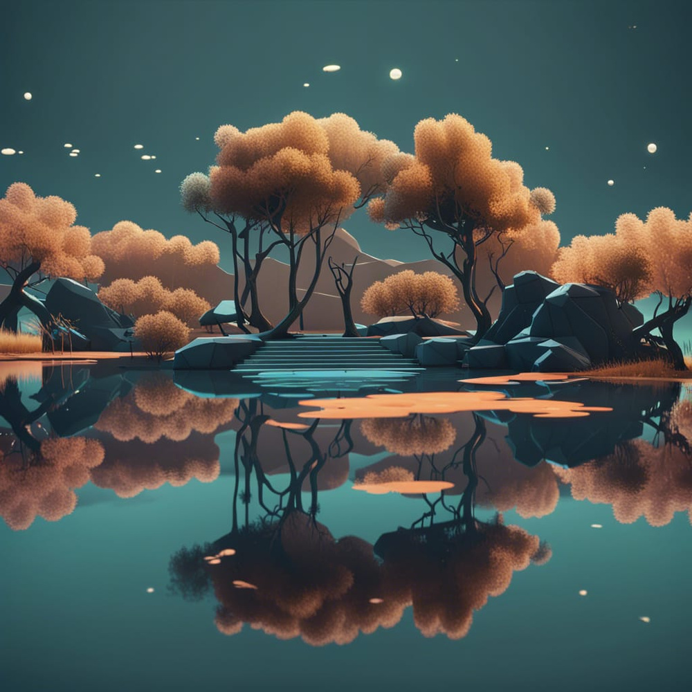 Flat design of a lake with nature elements. minimalist color and design made with NightCafe Studio using Mecha preset with SD.