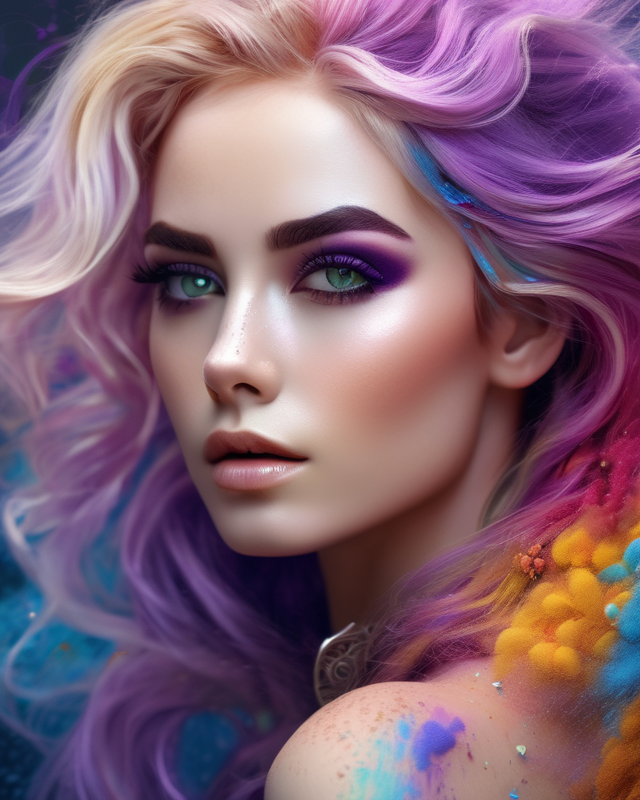 A portrait of a lady with pastel purple wavy hair with sprinkling colors using Hydra model in Starry AI.