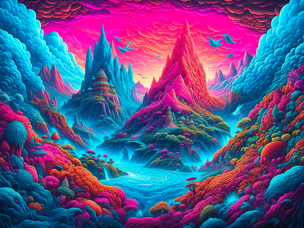 A fantastical landscape inspired by the intricate art of Dan Mumford, with vibrant colors and dynamic composition, featuring towering mountains and mystical creatures, captured with a tilt-shift lens to create a miniature effect made with Easy Peasy AI