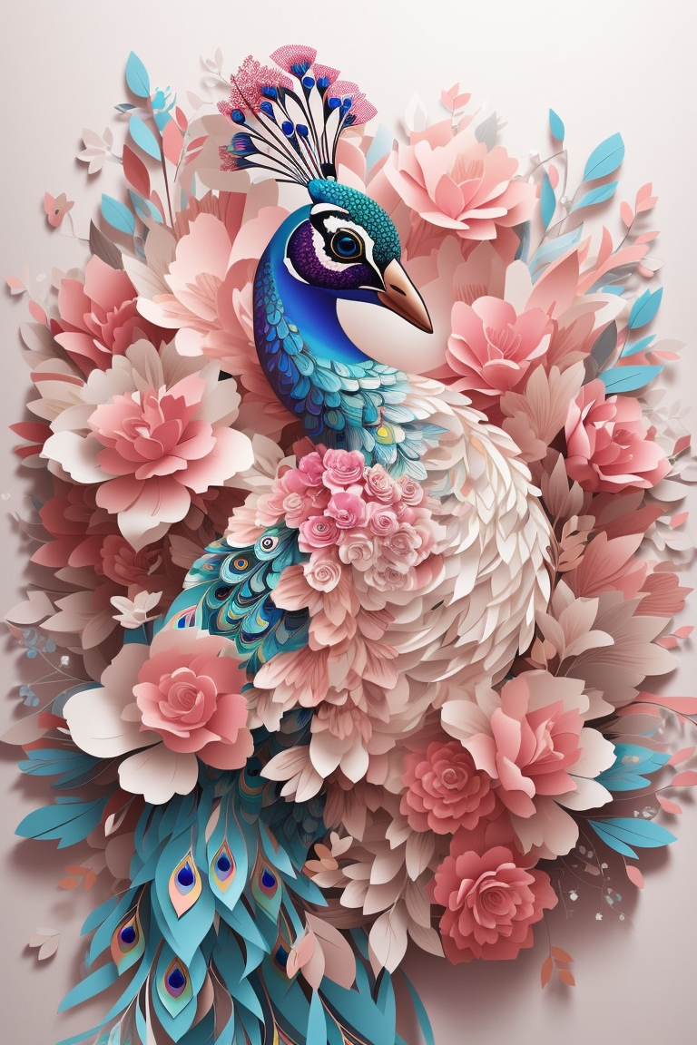 Detailed illustration of a print of a colorful peacock, pastel flowers splash, light blue, white and pink pastel colors,cute, fantasy art made with RPG 4.0 in Leonardo AI