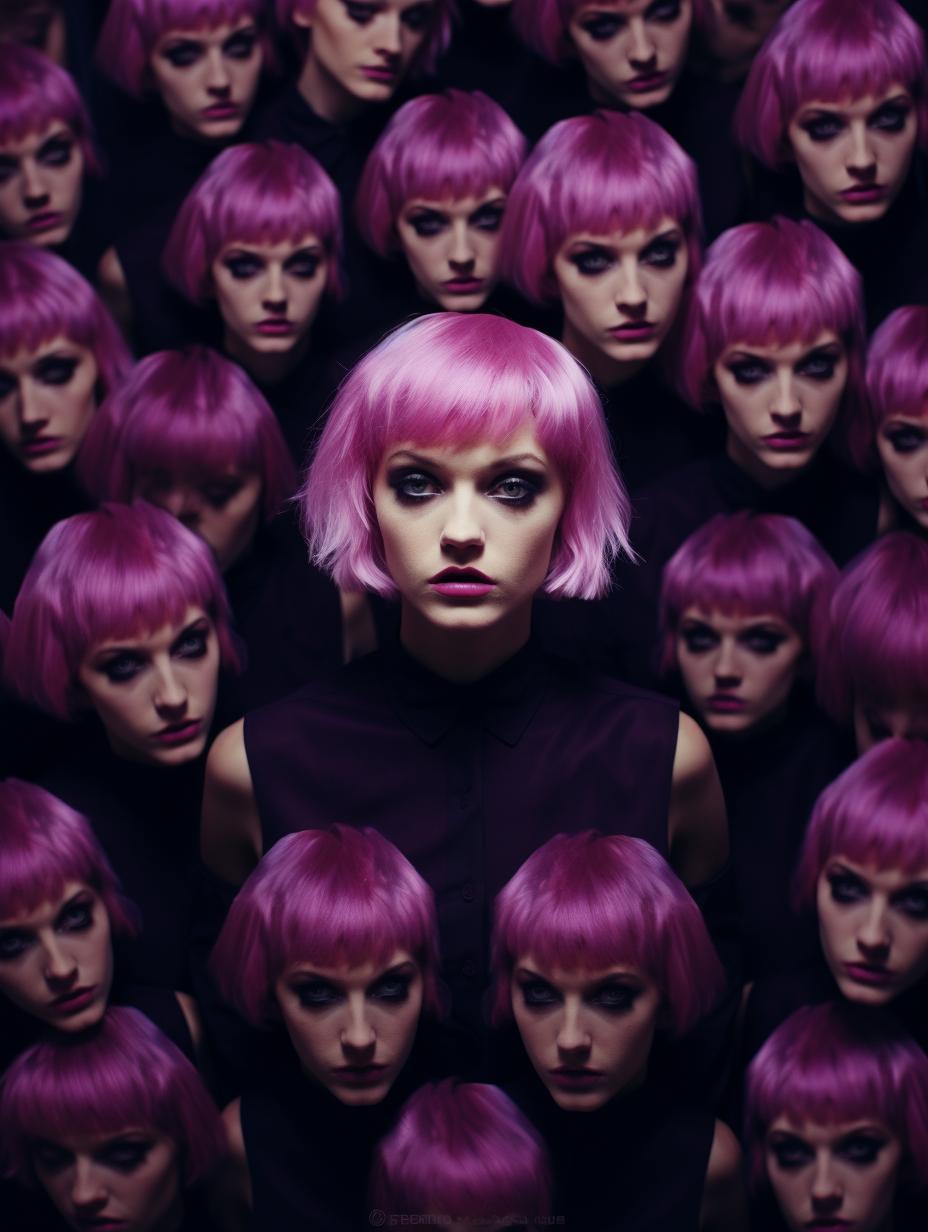 Multiple pose lomography ladies with neon purple hair floating in a hexagon tesselation –v 5.2 –ar 3:4 made with Midjourney