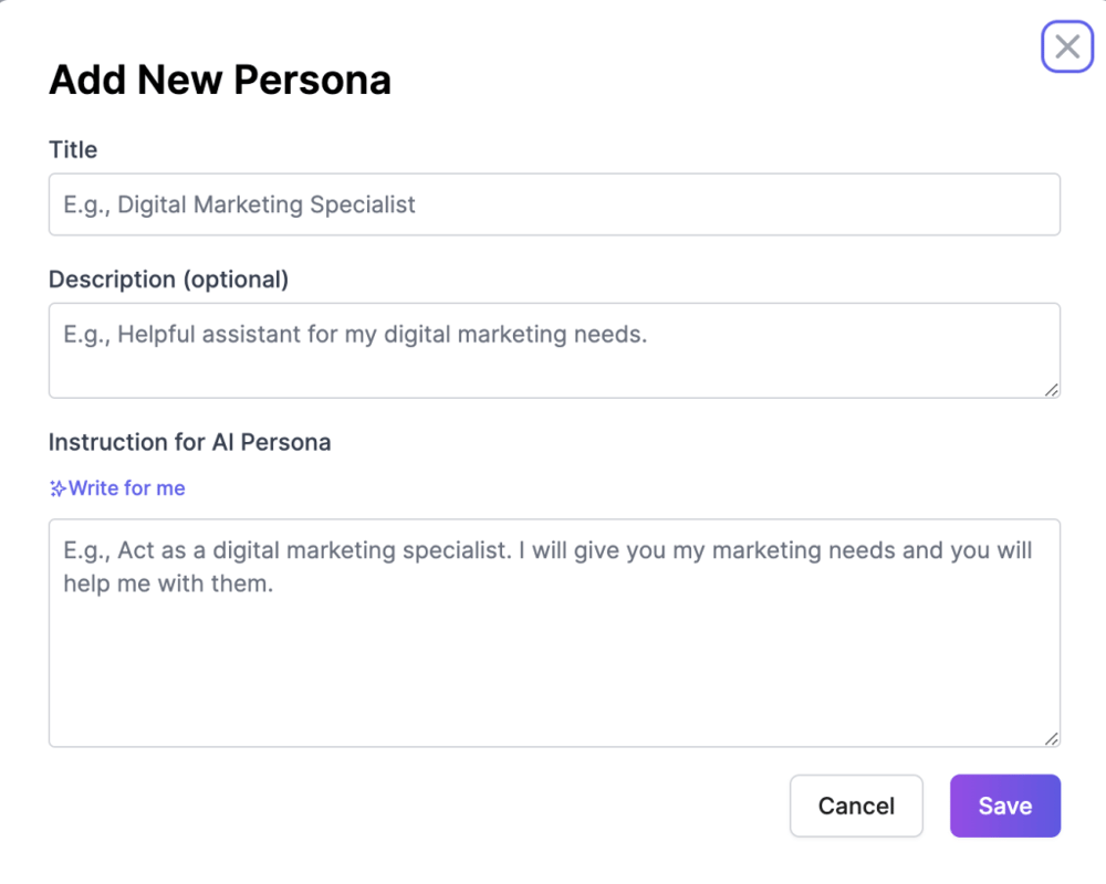 In the form, provide a title for your persona. This could be anything from ‘Digital Marketing Specialist’ to ‘Coding Assistant’. You also have the option to provide a description.