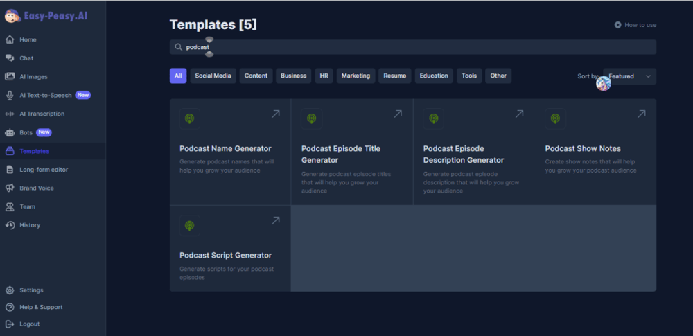 We all know how intimidating a blank page can be. But with Easy Peasy AI, you can wave goodbye to that dreaded blank page. How? It’s simple – with our vast array of over 220 templates tailored for different writing tasks, including Podcast Name Generator, Podcast Episode Title Generator, Podcast Episode Description Generator, Podcast Show Notes and Podcast Script Generator. With just a couple of clicks, you can select a template that fits your needs, pop in some relevant keywords, and voila! You’ve got a high-quality piece of content, hot out of the AI oven, ready to be served to your eager audience.