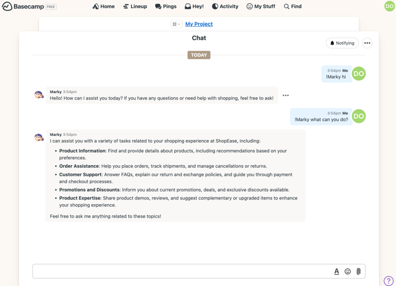 Congratulations! You’ve successfully integrated your Easy-Peasy.AI bot with Basecamp. Your team now has access to an intelligent assistant that can answer questions, provide information, and help automate tasks directly within your Basecamp workspace.