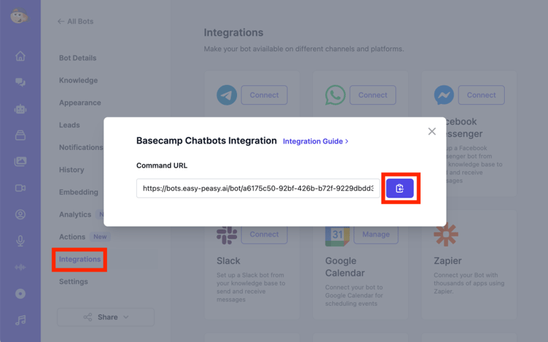 https://bots.easy-peasy.ai/bot/YOUR-BOT-ID/basecamp - Click the Copy button to copy this URL to your clipboard