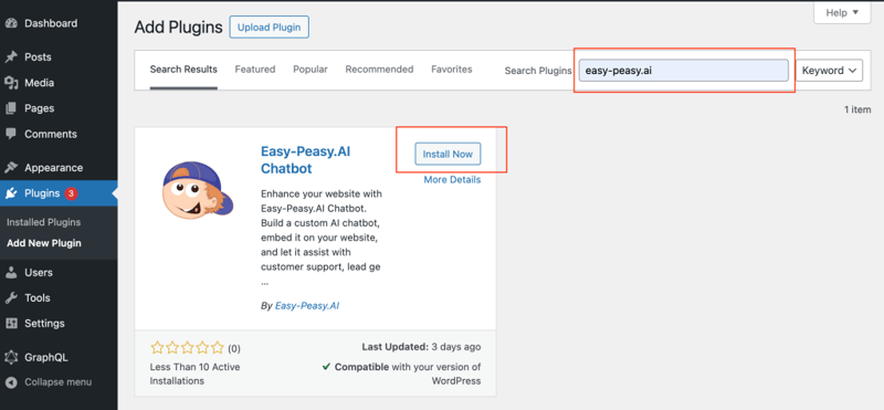 - Find the Easy-Peasy.AI WordPress plugin, click “Install Now”, and then “Activate”.