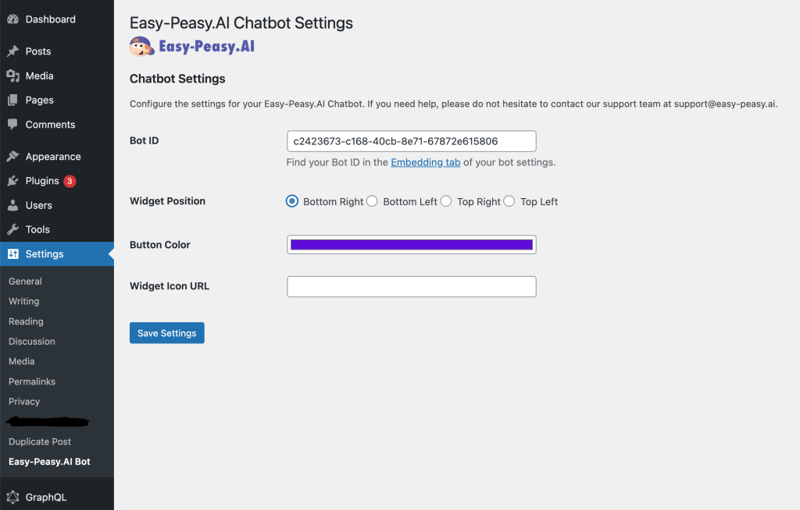 - Your Easy-Peasy.AI chatbot should now be live on your WordPress website!