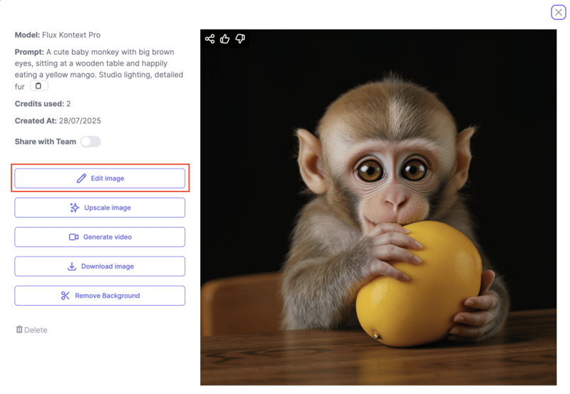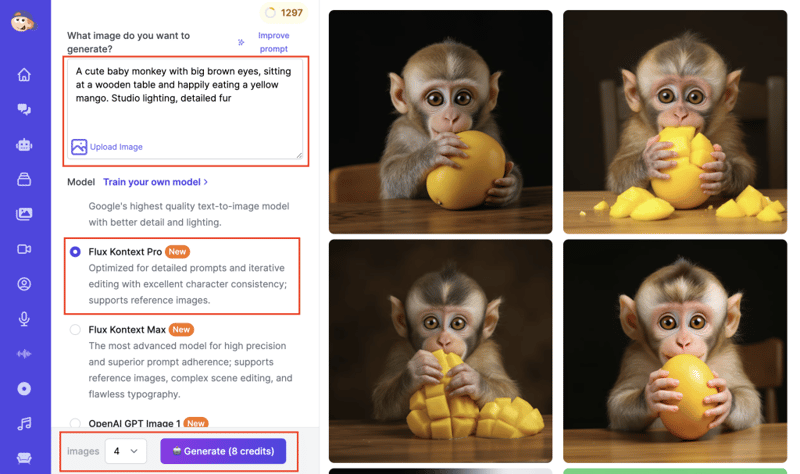 A cute baby monkey with big brown eyes, sitting at a wooden table and happily eating a yellow mango. Studio lighting, detailed fur. - Select the FLUX.1 Kontext model for the best results with character consistency.