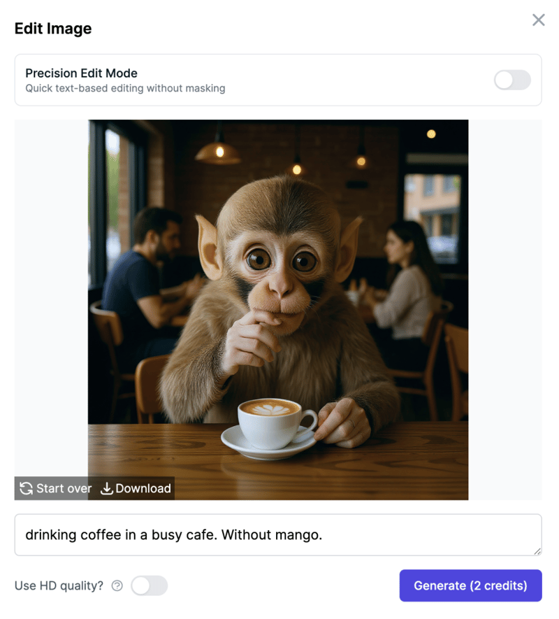 drinking coffee in a busy cafe. Without mango. - Click Generate. In seconds, the AI will place your character in the new environment.
