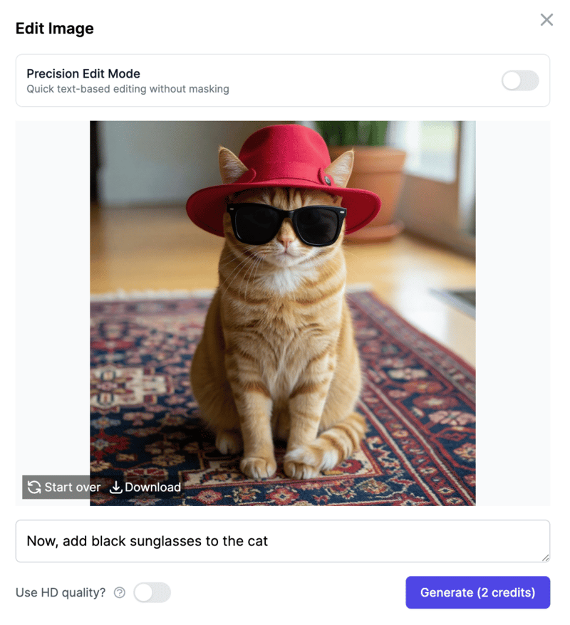 Now, add black sunglasses to the cat. - The AI will add sunglasses while keeping the red hat.