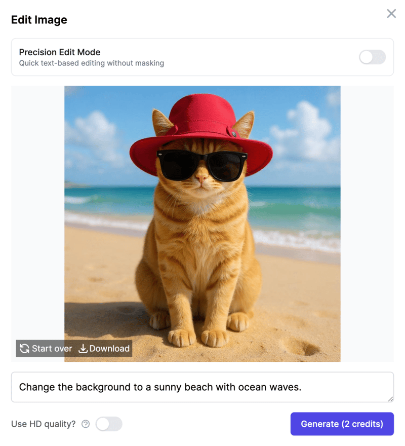 Change the background to a sunny beach with ocean waves. - The AI will change the entire background while leaving your fully-accessorized cat as the main subject.