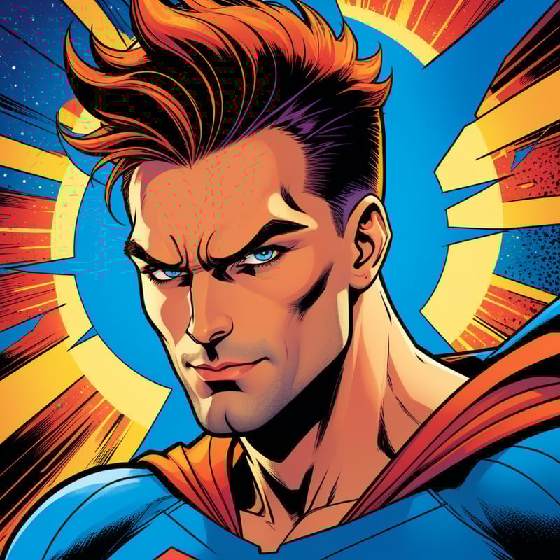 Prompt: "superhero style portrait of a man, bold outlines, dramatic shading, comic book aesthetic"
