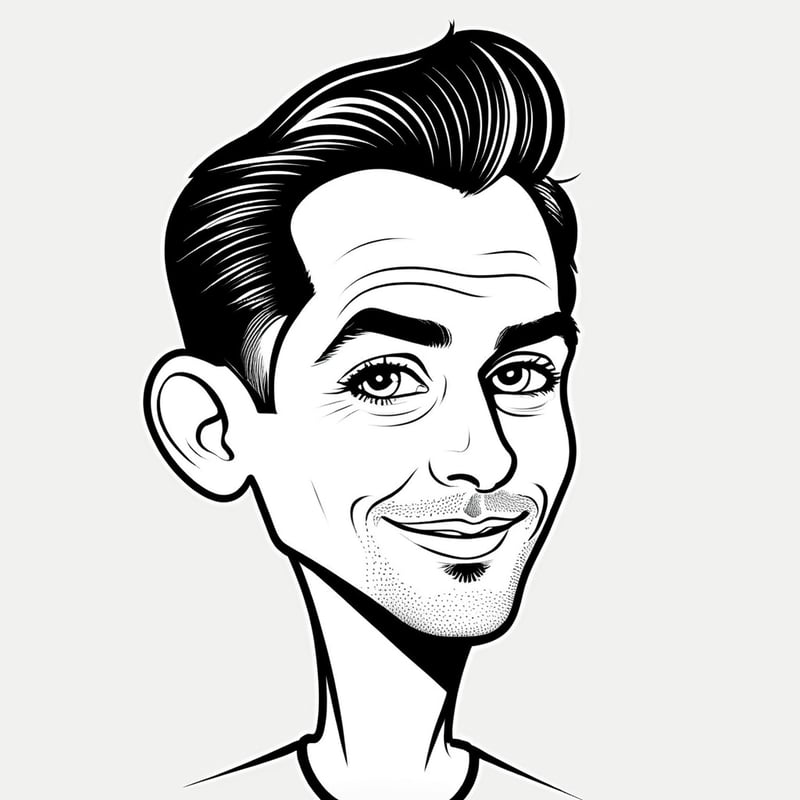 Prompt: "black and white caricature of a man, clean lines, exaggerated features, white background, no shadows"