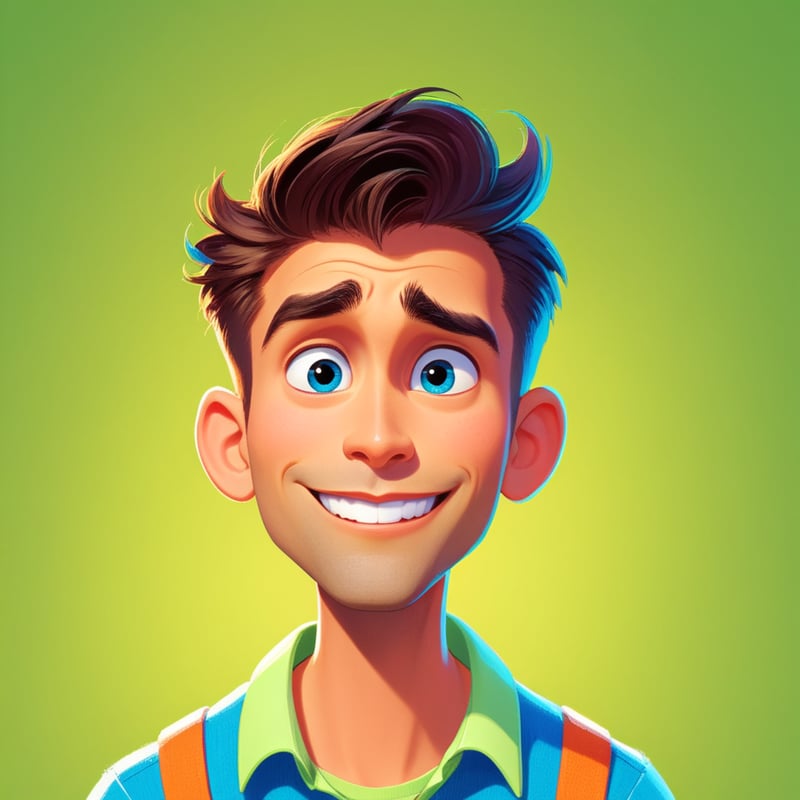 Prompt: "animated portrait of a man in Disney style, vibrant colors, expressive eyes, cheerful expression"
