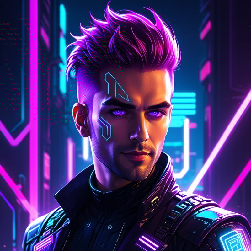 Prompt: "cyberpunk portrait of a man, neon highlights, glowing elements, tech-inspired details"
