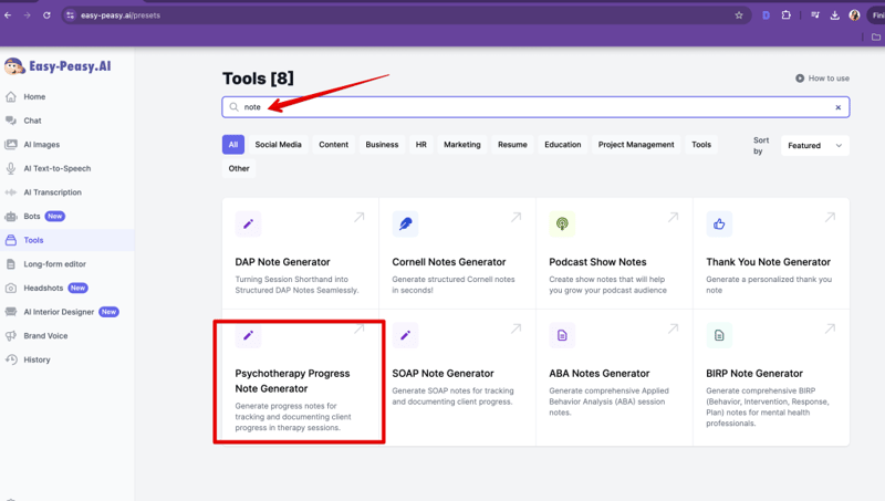 - Type “note” in the search bar and click on “Psychotherapy Progress Note Generator.”
