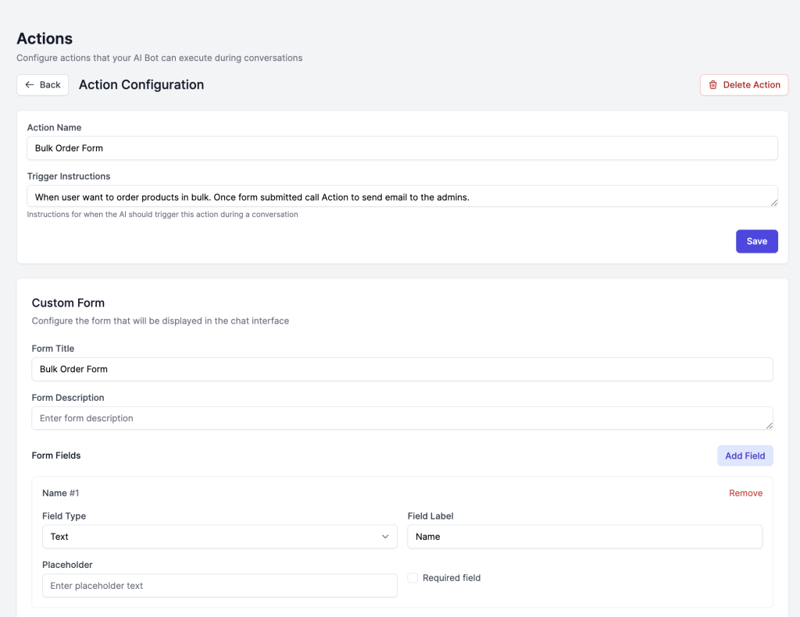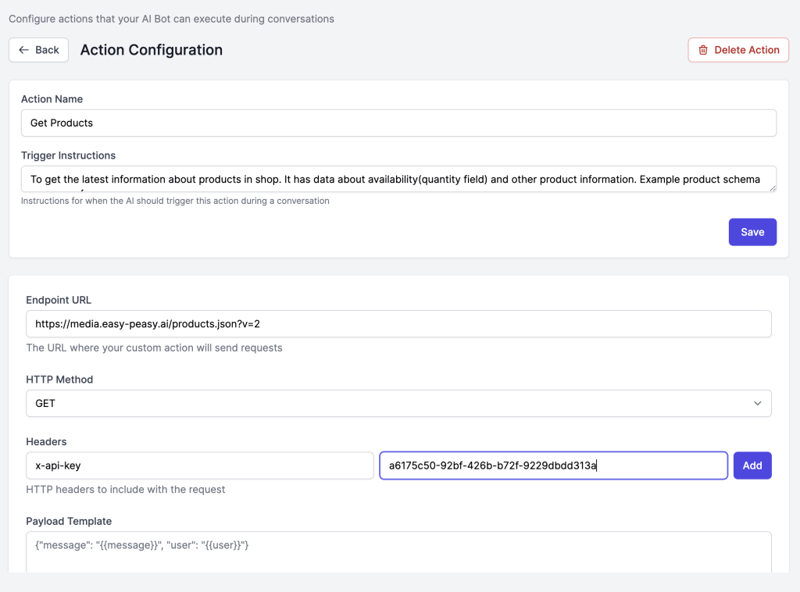 What it does: Connects your bot to any external API, database, or custom system. This is the most powerful and flexible action type.