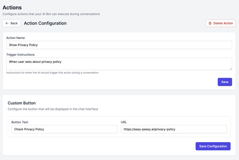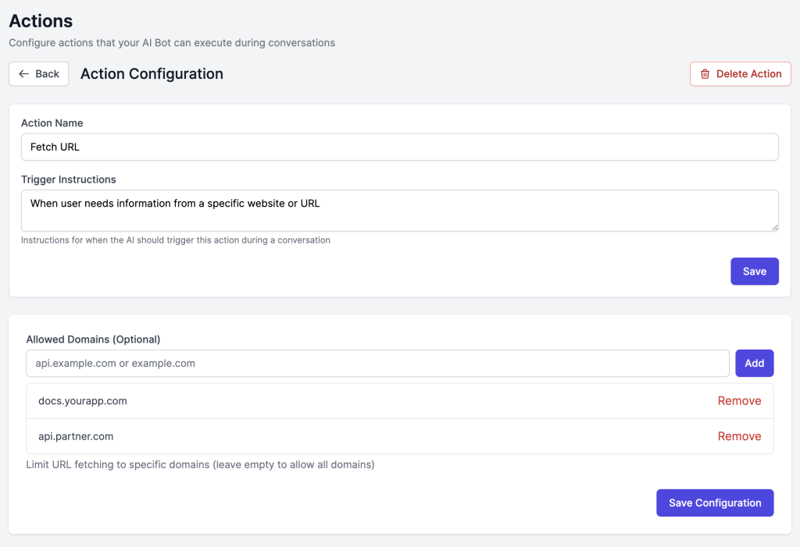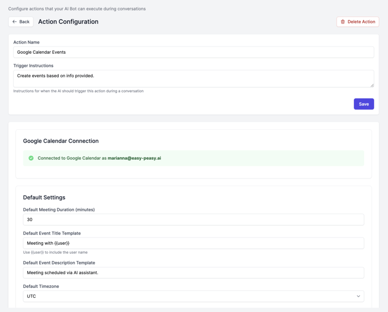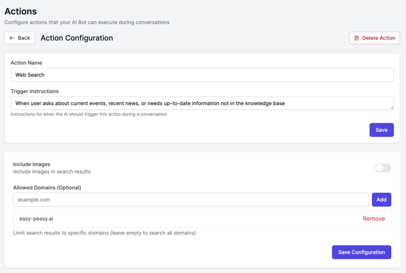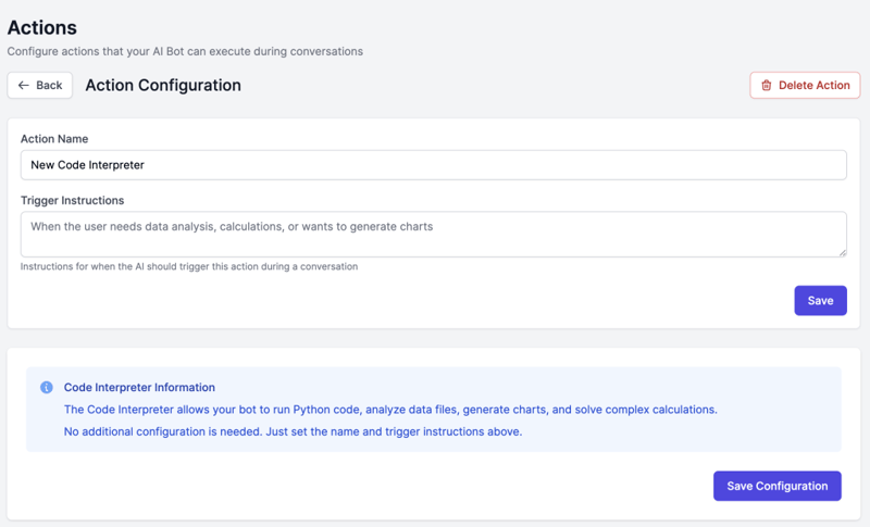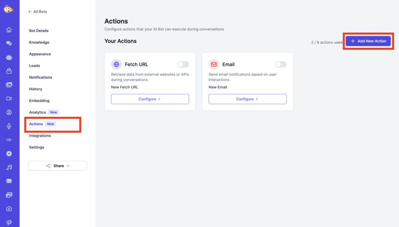 A: You can add unlimited actions to a bot. However, some action types are “singletons” (Web Search, Code Interpreter, Fetch URL, Google Calendar) meaning you can only have one of each type per bot. This is because these actions are automatically invoked when needed rather than based on specific triggers.