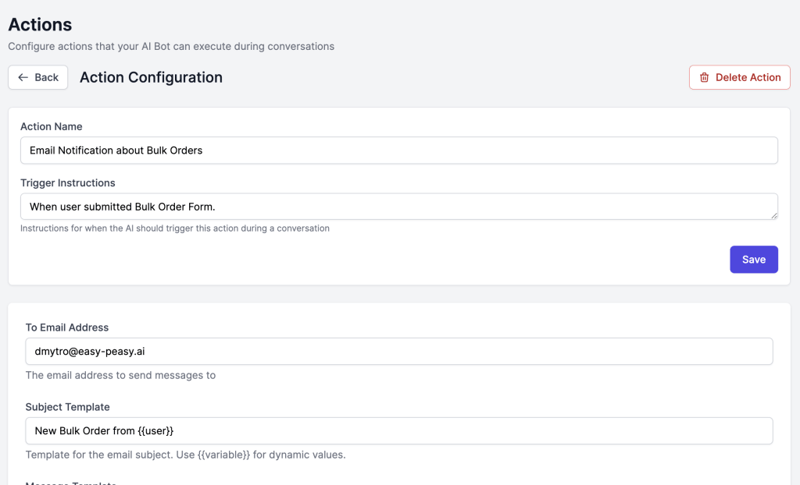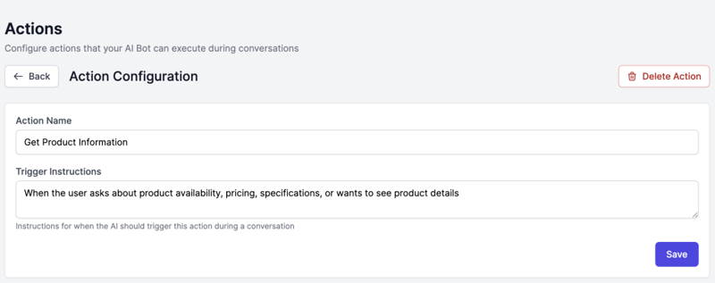 Bot Actions transform your chatbot from a simple question-answering system into an intelligent agent that can execute real tasks. Instead of just retrieving information from a knowledge base, your bot can: