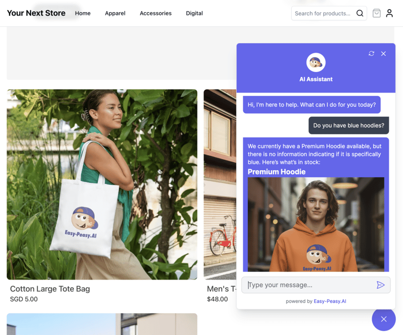 Bot can respond: “Great news! The Premium Hoodie is in stock with 23 units available at $75.00. Here’s what it looks like: [image]”