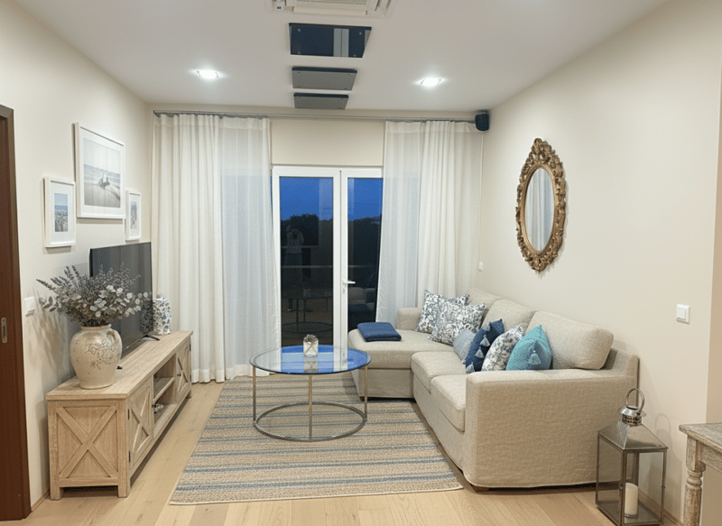 - ‘Replace the coffee table with a glass one and add potted plants on the windowsill.’