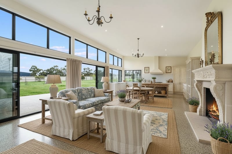 - ‘Smooth zoom in to showcase the living room furniture and lighting.’